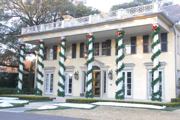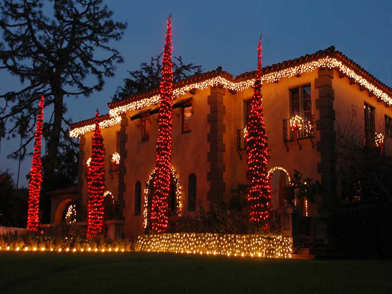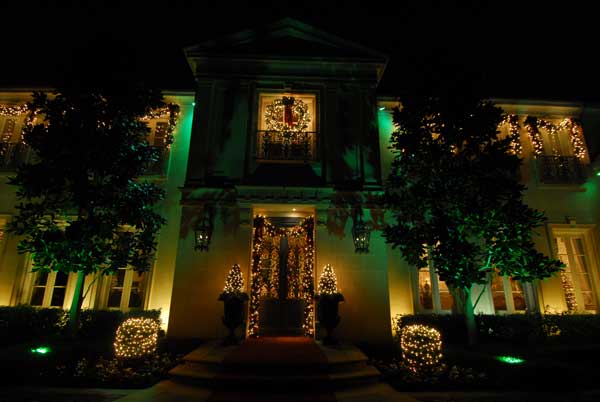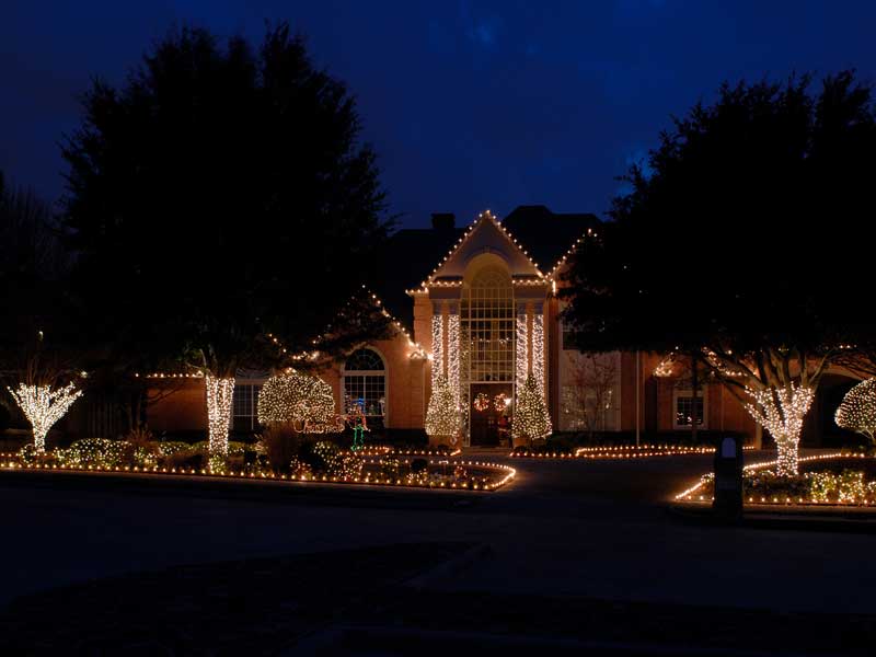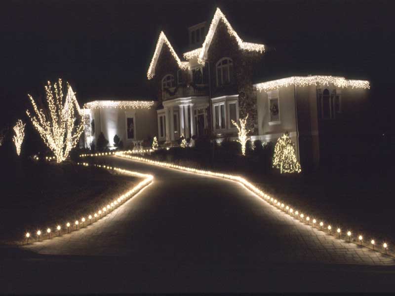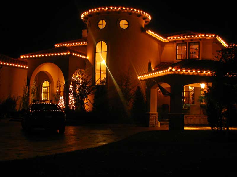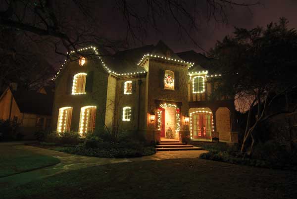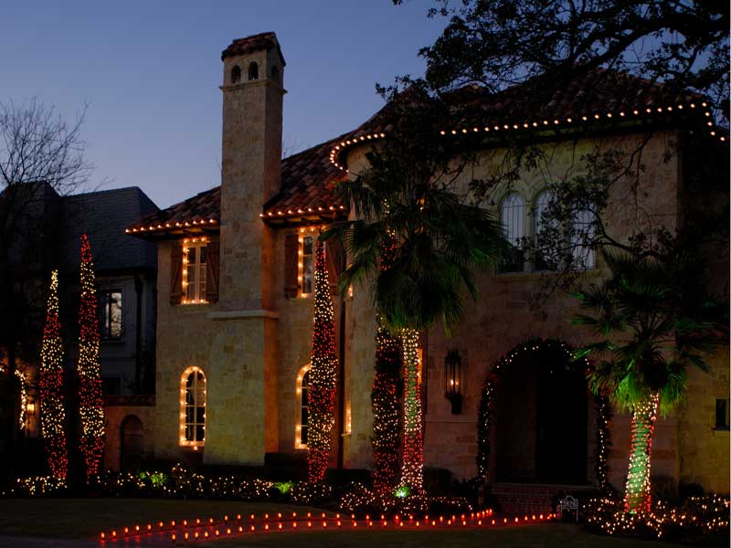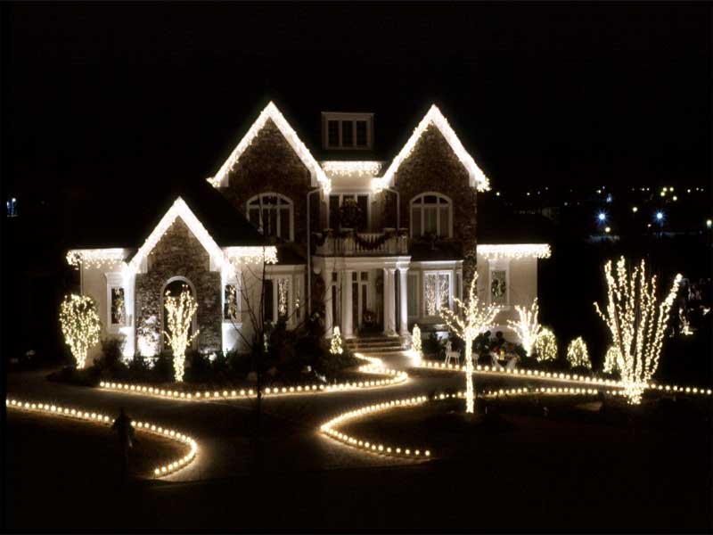 Decorate your rooftop by outlining rooflines, ridgelines, and dormers. Compliment the front of your home with lights around such things as windows, doors and other distinct features of your home. Other options include the lighting of bushes, hedges, and trees, as well as the outlining of flowerbeds, walkways & driveways with staked lights. Add wreaths and garlands for that finishing touch.